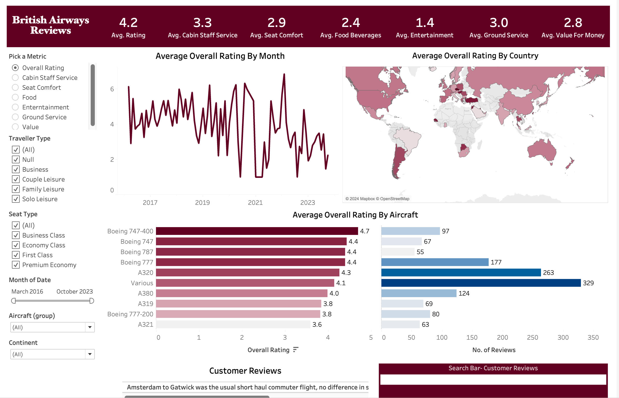 An intriguing feature of this dashboard is the search box, which allows users to display reviews containing any word entered in the search field