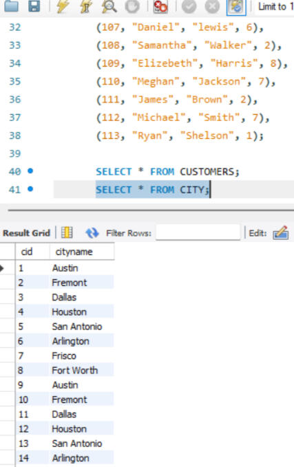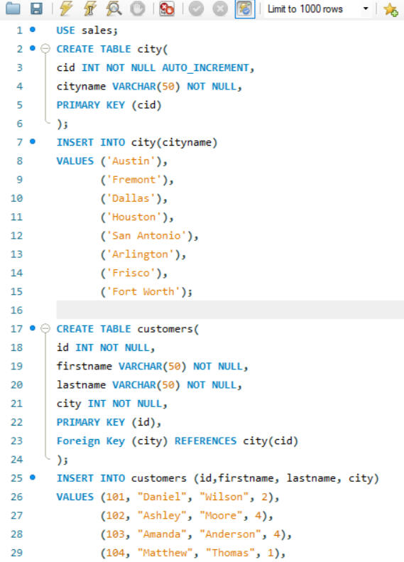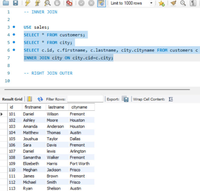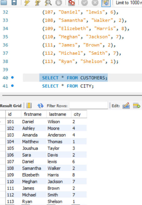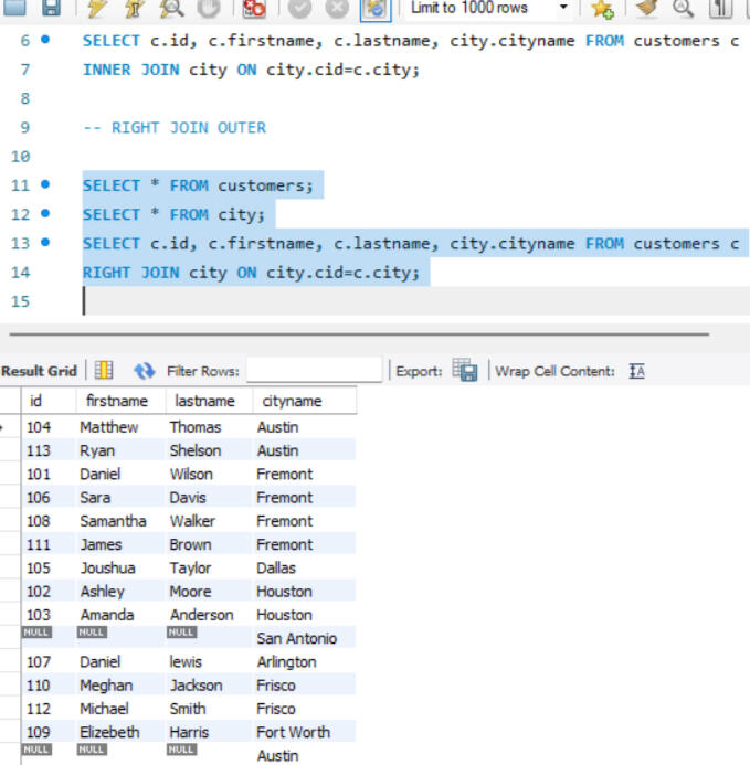 One of the key functionalities of SQL is the ability to create and manage datasets. Here, I created a dataset comprising two tables: customers and city. The customers table includes fields such as customer_id, first_name, last_name, and city_id, while the city table includes city_id and city_name. In this setup, customer_id in the customers table and city_id in the city table are designated as primary keys, ensuring their uniqueness for each row. Other attributes, such as city name and customer details, may vary. Additionally, I established a foreign key relationship between these tables. Specifically, the city_id column in the customers table acts as a foreign key, linking it to the city_id column in the city table. This foreign key relationship helps maintain referential integrity and facilitates the creation of meaningful connections between the two tables.