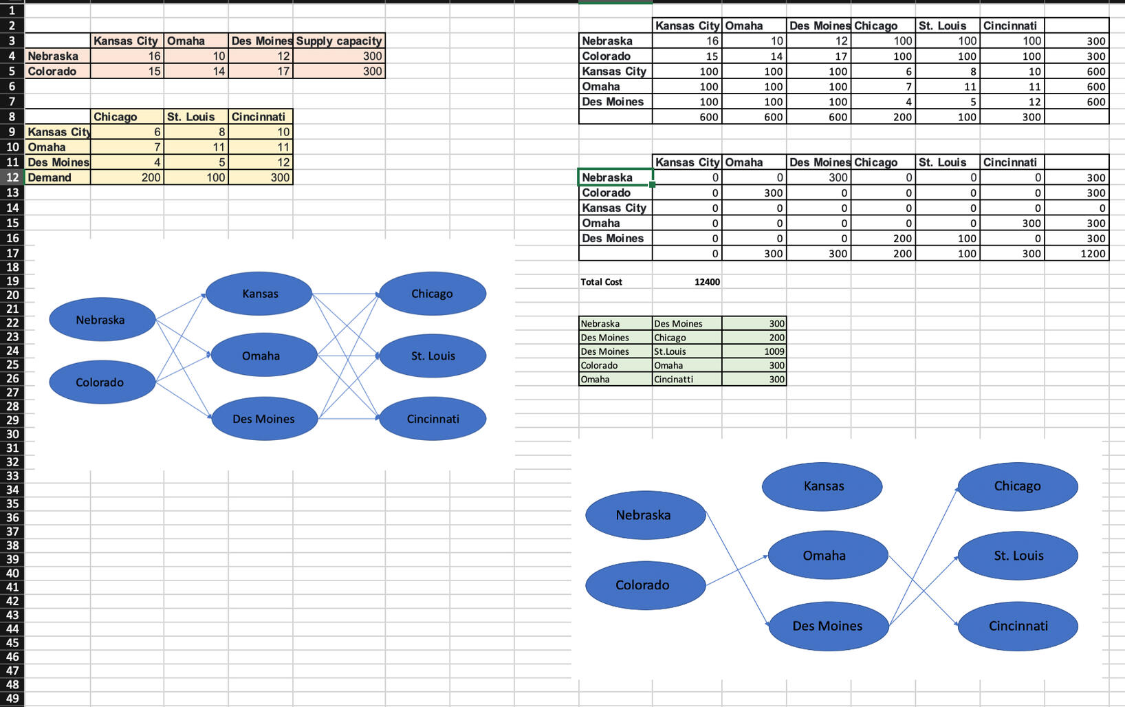 This is a transshipment problem for Manufacturing company, where the objective was to optimize the shipment of products to warehouse locations across the USA. This project involved applying linear programming (LP) techniques to determine the most cost-effective routing of goods through various transshipment points. By optimizing the transportation routes, the goal was to minimize overall shipping costs while ensuring timely delivery to all warehouse destinations. The new mapping on the right side on the above excel sheet suggests the best optimized route.