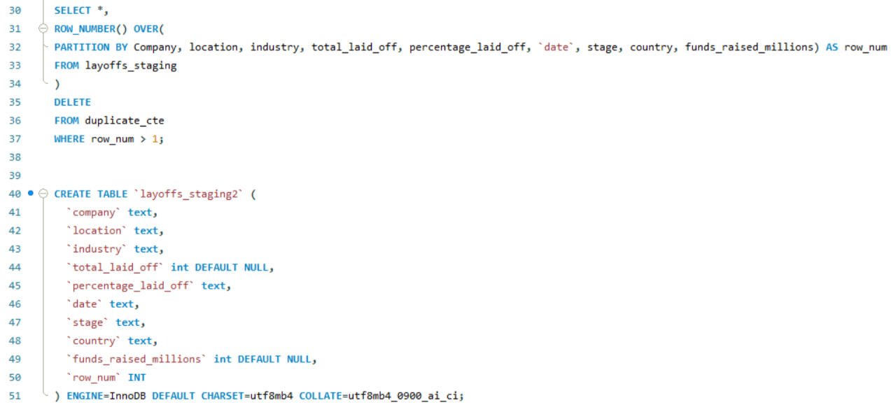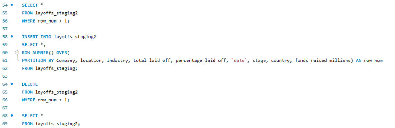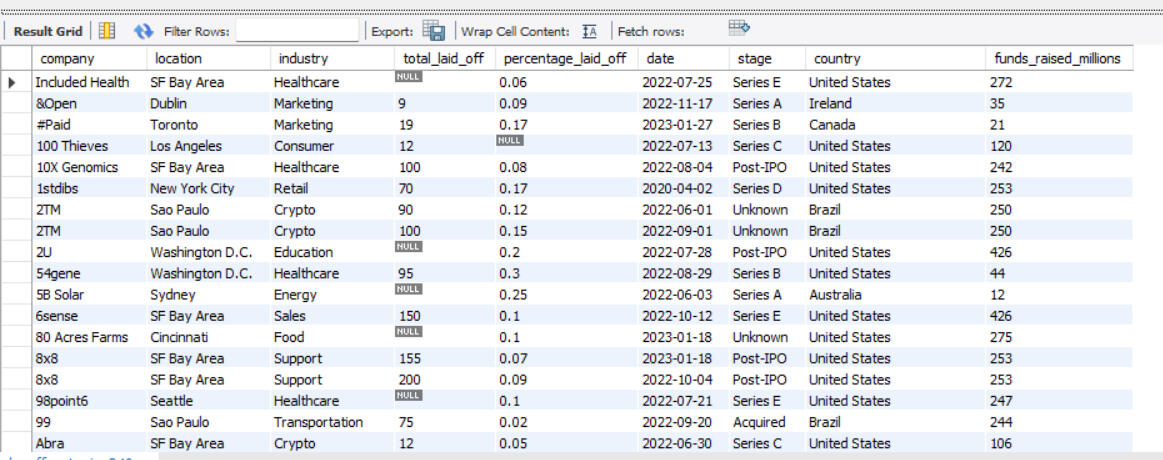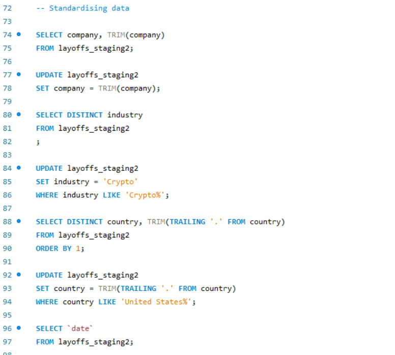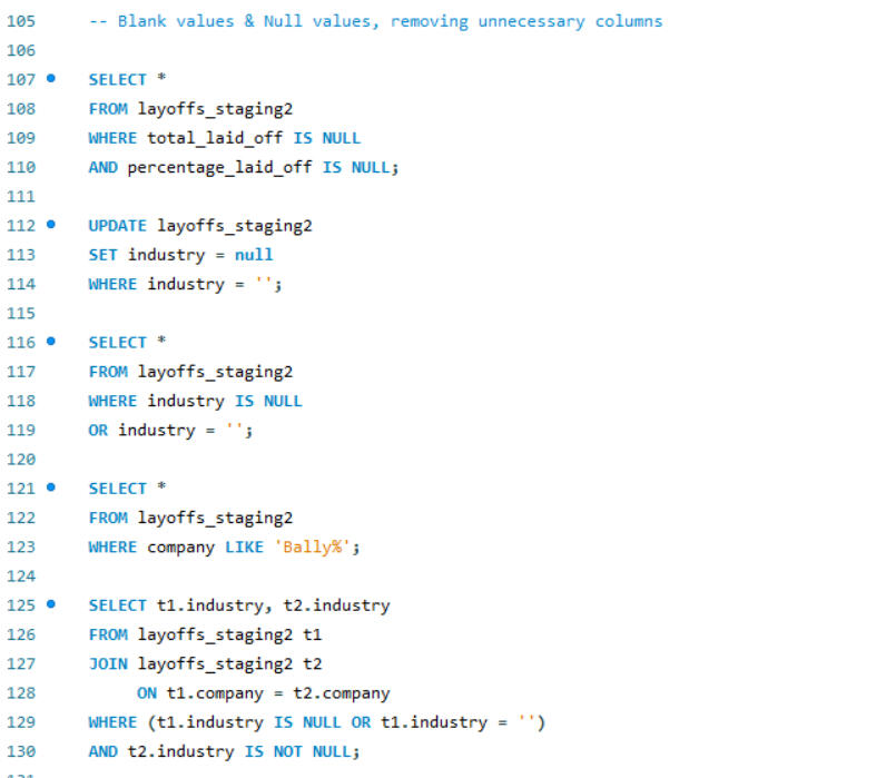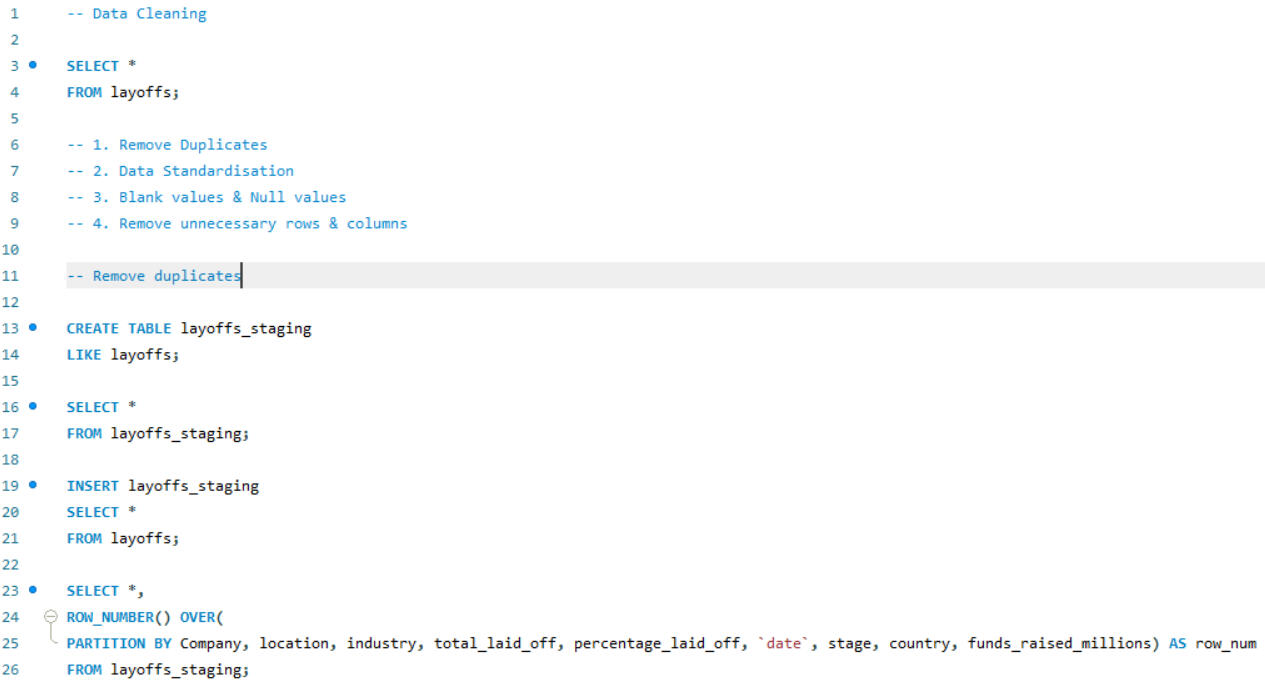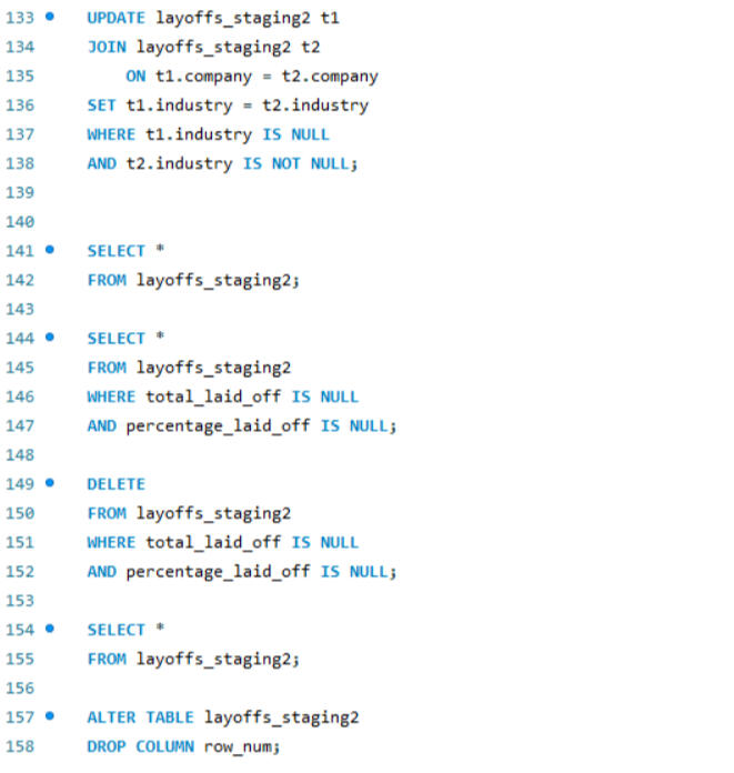 SQL is also a powerful tool for data cleaning. In this project, I worked on cleaning an employee layoff dataset, which involved several key steps: removing duplicates, standardizing data formats, handling blank and null values, and deleting unnecessary rows and columns. These processes ensures that the dataset was accurate, consistent, and ready for further analysis.